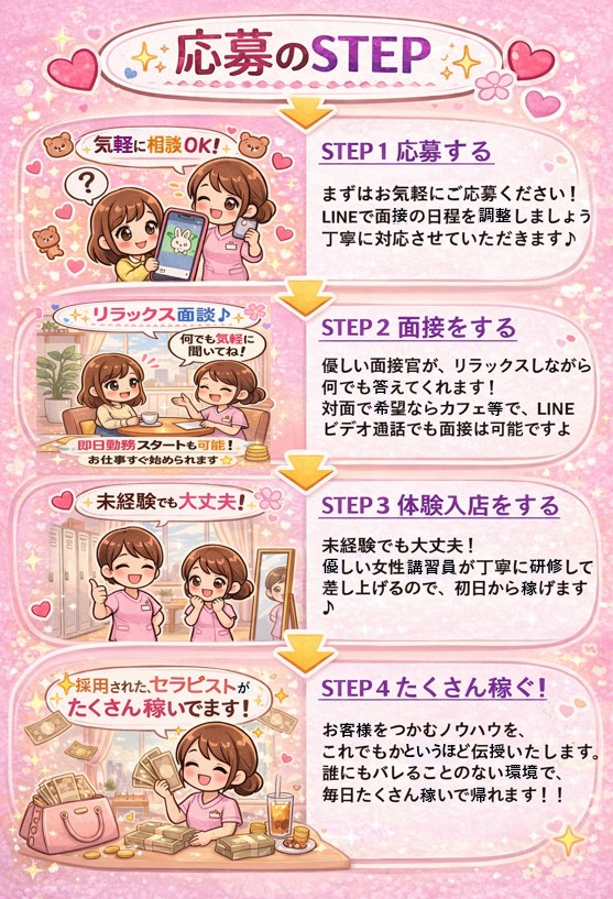 出勤の強制やノルマ制度などは一切なく、女性が働きやすい環境整備に全力を尽くしております。セクハラやパワハラも一切なし!未経験の方には女性講習員による優しい研修もご用意しておりますので、ご安心ください。電話、LINE等から、ぜひともお気軽にご連絡ください!
